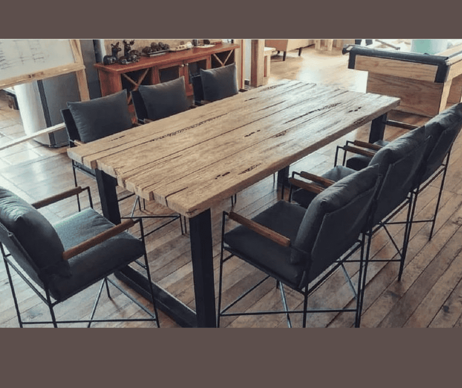 Materiales: Mesa. Pino avejentado y metal Sillas. Redondo 3/4, madera, cojinera en telal gris.