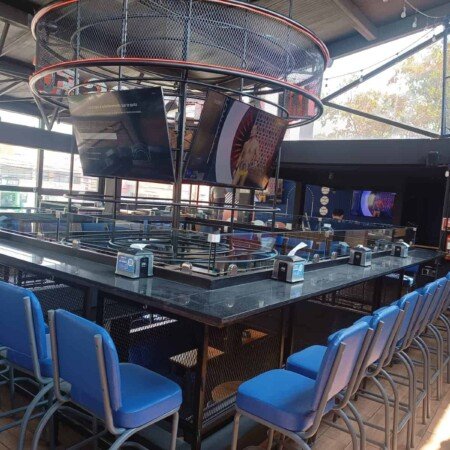 Mesa circular de encino montada sobre barrica metálica reutilizada; rodeada de taburetes acolchados