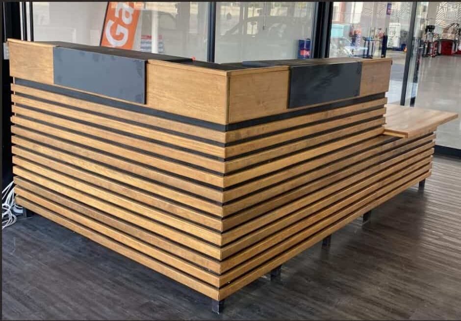 Mueble de recepción en “L” con listones horizontales de encino tostado y bandas grafito; incluye módulo lateral de servicio y zócalo metálico