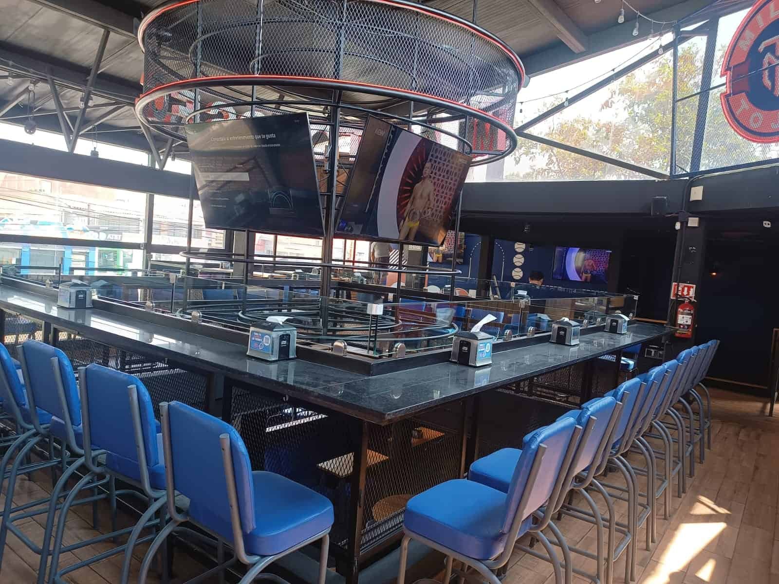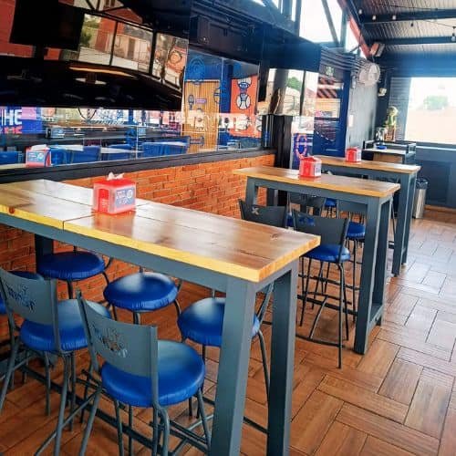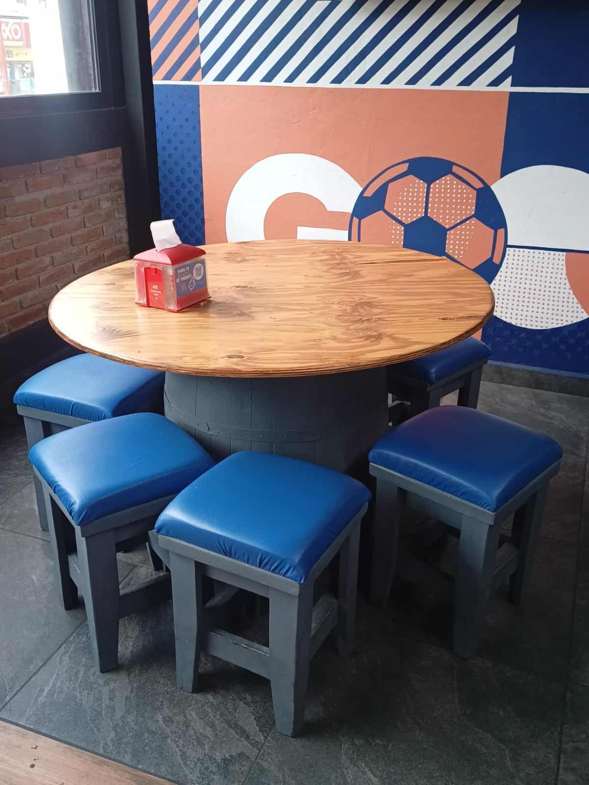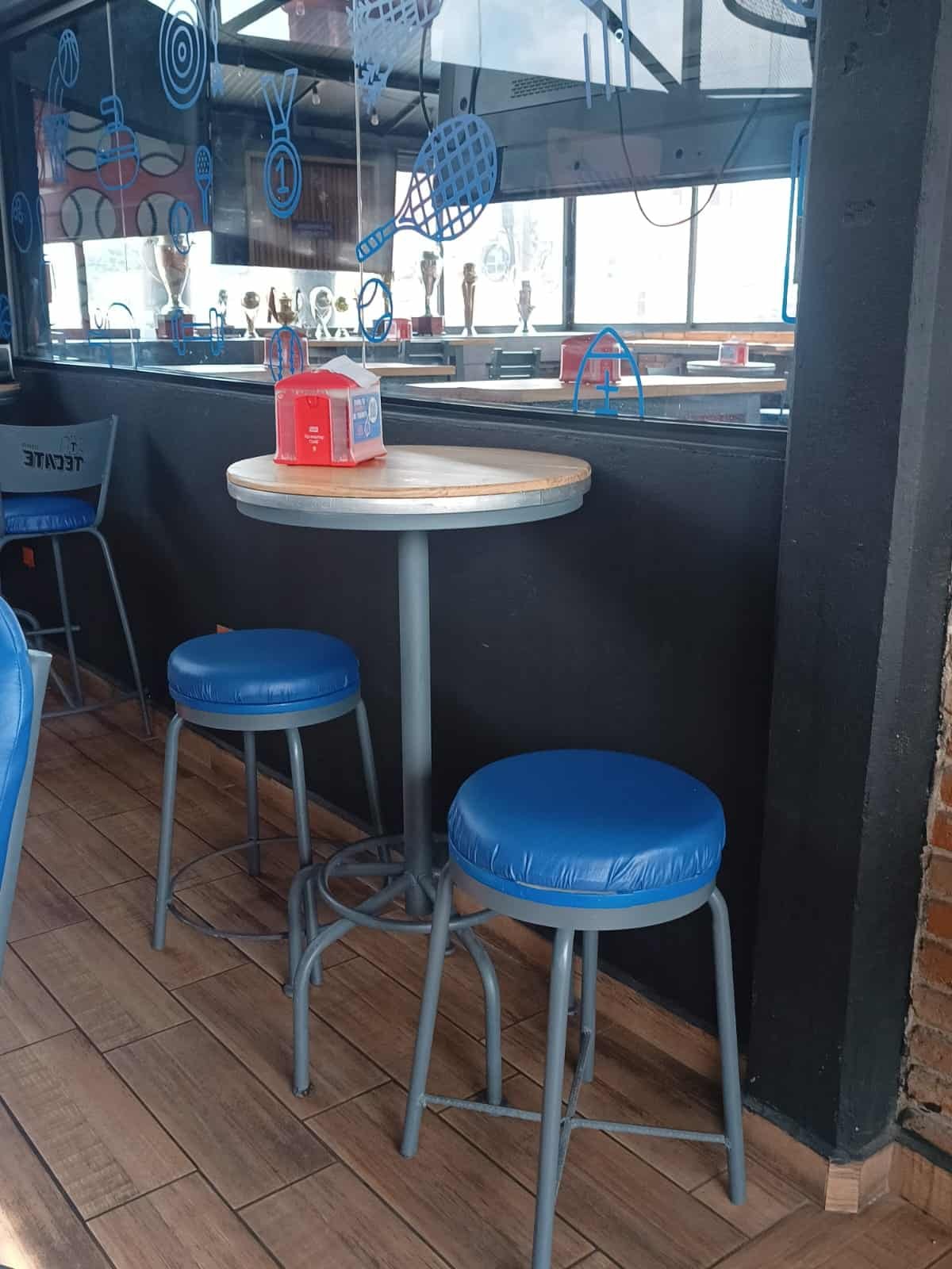 Mesas altas en encino con base metálica tipo caballete y bancos tapizados en vinil azul stadium