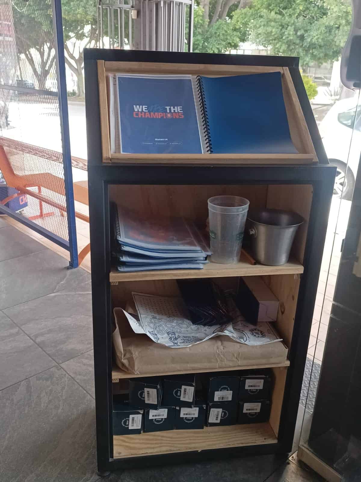 Podio de recepción en acero y malla deployé, repisa superior y entre-paño interior en pino sólido