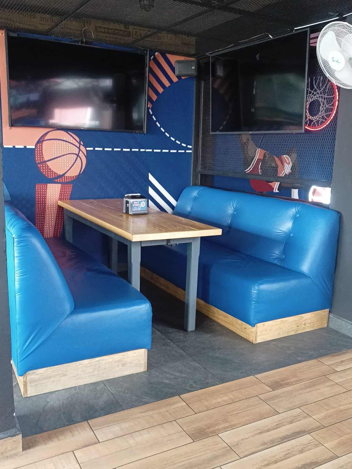 Conjunto tipo cabina tapizado en vinil azul stadium con zócalo de encino claro; mesa rectangular en madera sólida y patas metálicas gris grafito. Diseñado para 4–6 personas, optimiza rincones y aporta un look deportivo premium.