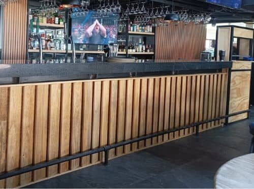 Frente de bar modular en tzalam listonado y cubierta de granito negro, con zapata tubular para reposapiés
