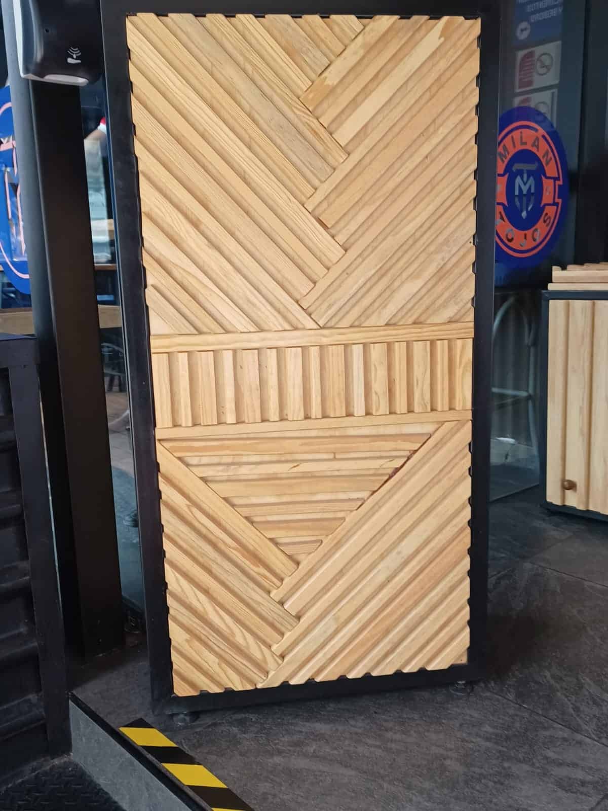 Puertas con patrón diagonal/vertical combinados sobre bastidor de acero; acabado natural sellado.
